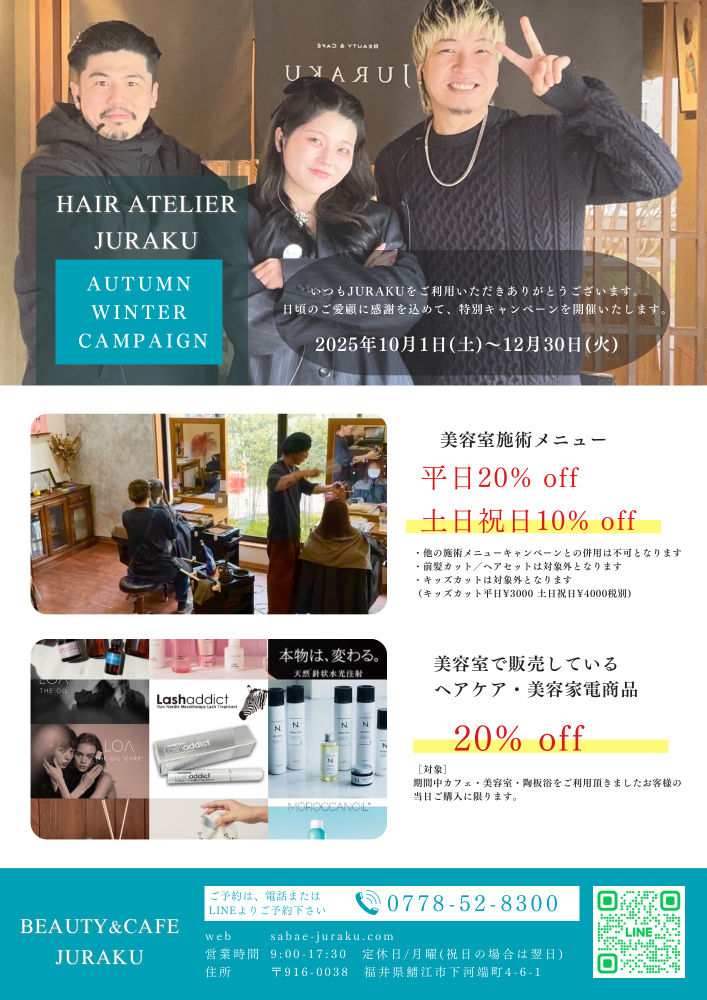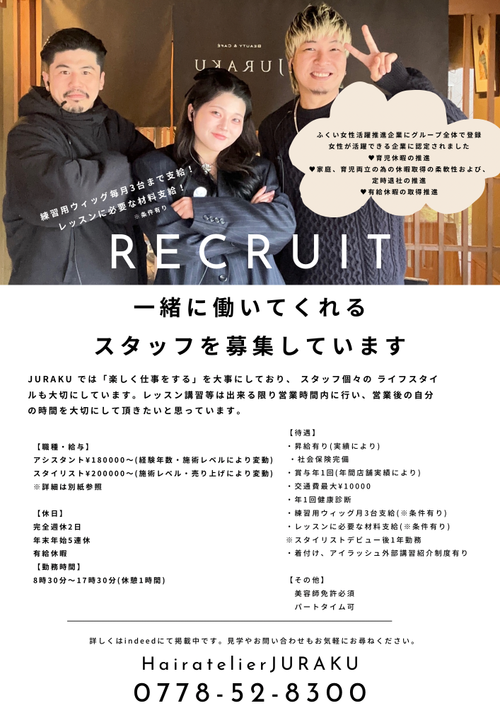 JURAKUでは基礎を大切にし、正しい知識・正確な技術・お客様としっかり共有するカウンセリング力を教育致します。