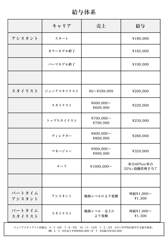 アシスタント¥180000〜¥190000(経験年数・施術レベルにより変動)
